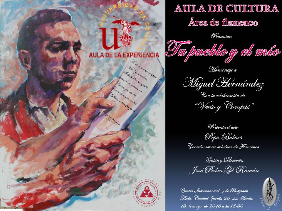 El Grupo de Flamenco del Aula de la Experiencia de la Universidad de Sevilla (Aula de Cultura), organiza el espectáculo de música y poesía Tu pueblo y el mío, en el que se rendirá homenaje a la figura de Miguel Hernández.